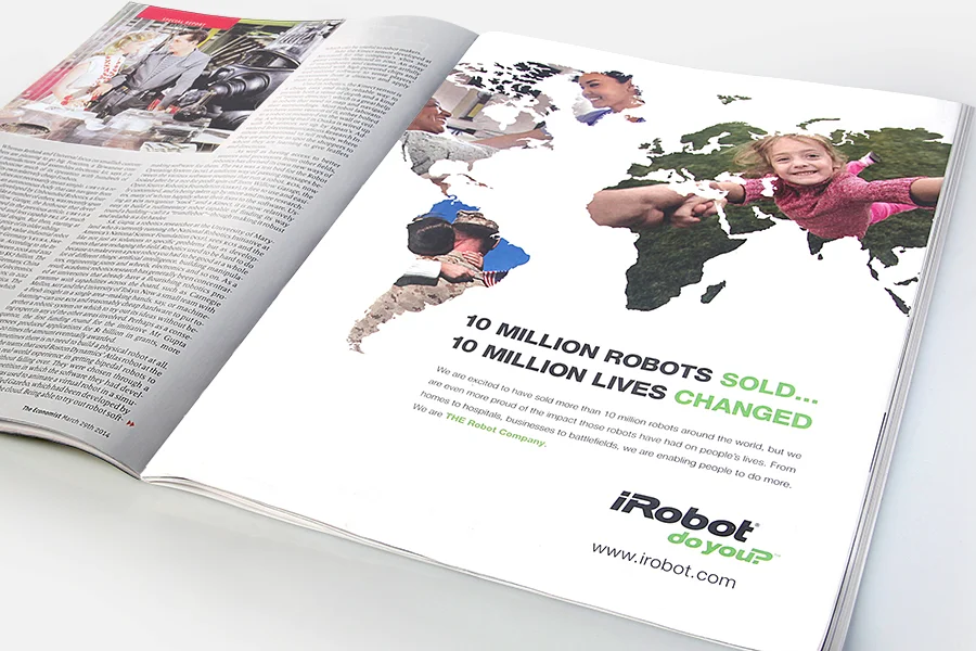 This iRobot ad was created for the March 29 - April 4th edition of The Economist. It is the first iRobot ad incorporating all three business units and introduces them as "THE Robot Company".