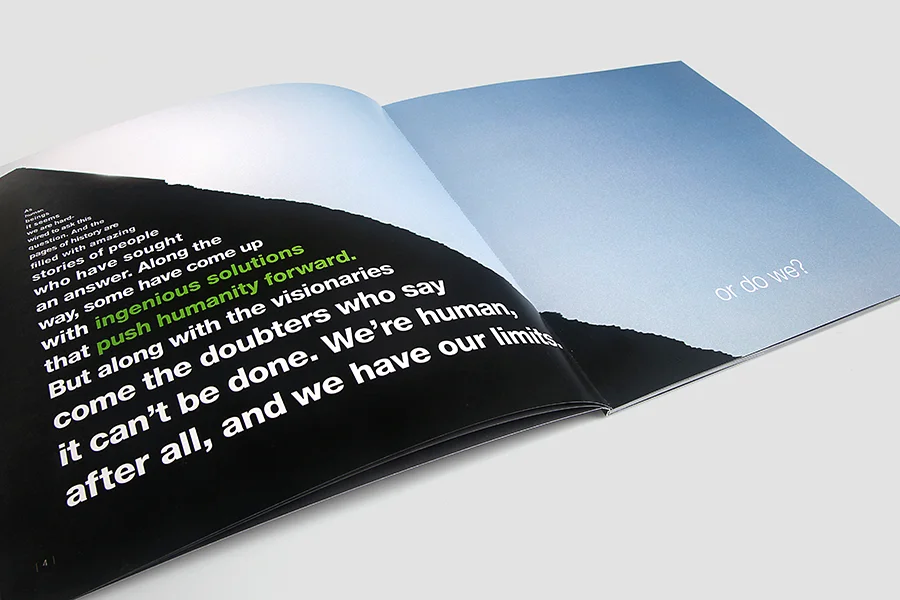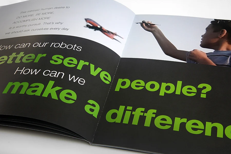 This book was created to introduce iRobot's new corporate vision. The shift in philosophy puts more emphasis on the humanity of it's consumers rather than the products. The theme of "Empowering People to Do More" is predominant throughout the document.