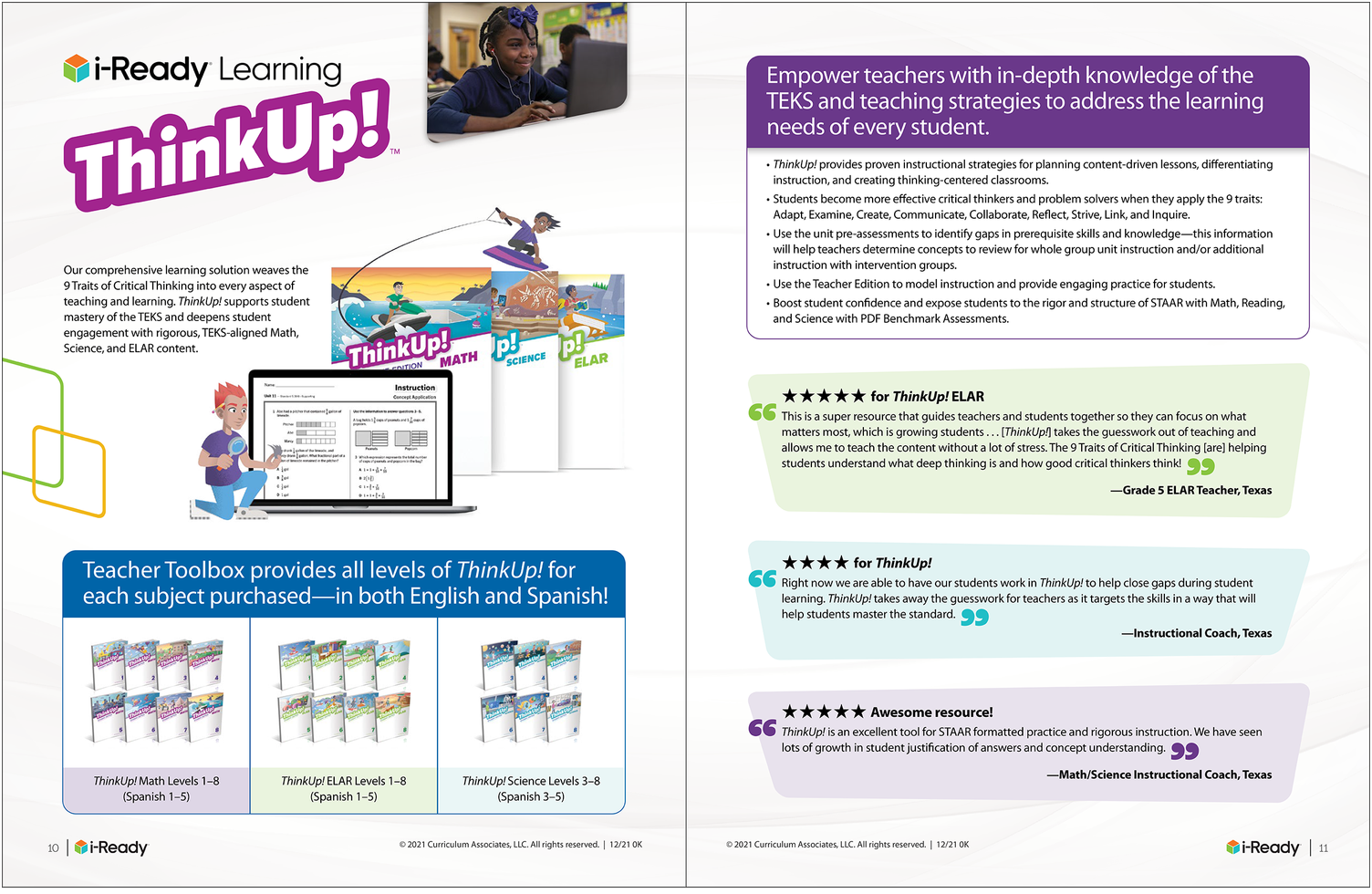 This is a spread from Curriculum Associates’ Teacher Texas Toolbox. ThinkUp! is a new in-depth comprehensive learning tool developed to deepen students engagement in Math, Science and English language arts and reading.